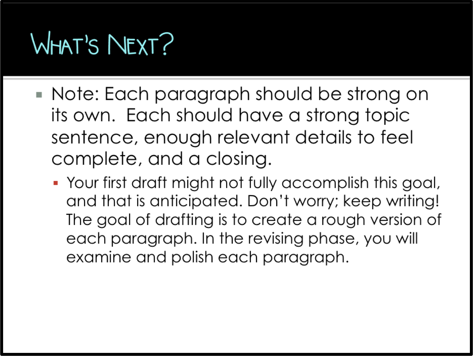 Adding these extra points should only take a few minutes and serves to get the juices flowing, especially if you are picking up on drafting on a separate day from creating the initial outline. Don’t belabor this part of the drafting activity!