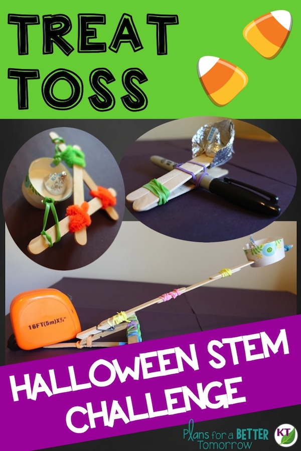 Hi! Can you believe it’s already week four of the Halloween STEM challenges? Today we’re going to be talking about Treat Toss. The initial premise was this was built around a fictional character named Mr. Jones. He gets sick at Halloween but he wants to make sure that he’s able to give the Halloween treats to the trick-or-treaters without getting them sick, so he builds a treat toss.