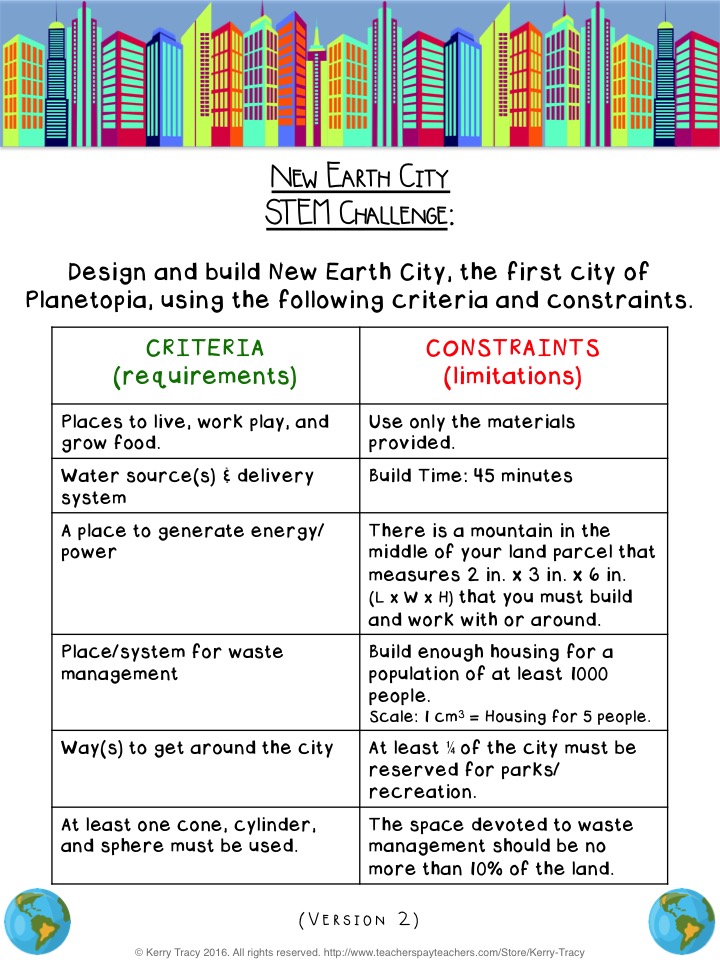 Maybe Rome wasn’t built in a day, but New Earth City can be! This challenge is perfect for Earth Day, but it can really be used any time of the year. Fun fact: my master’s degree is in design-based learning, which shares many similarities with the engineering design process. This city-building challenge was my gateway drug into the STEM Challenge world. (More on that can be found here.)